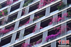 居民楼被三角梅装点成“花墙”。张浪 摄粉色的、紫色的花瓣将整栋楼外墙装
