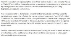 18日晚,国际足联在官网发布公告,FIFA基金会将组织一场慈善比赛,以此来筹措